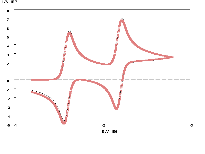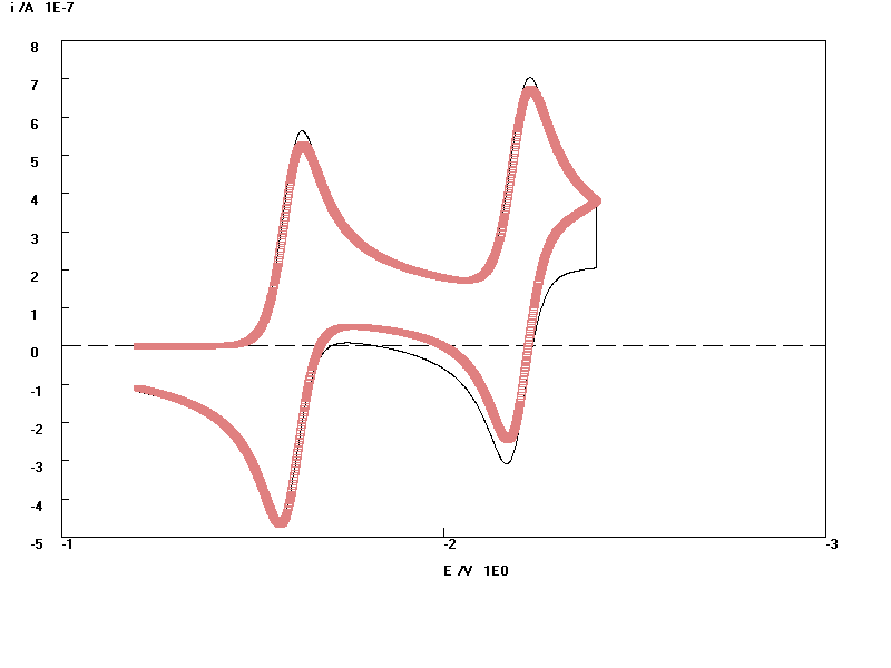 CV, scan rate = 1 kv/s, fit a simulated curve to experimental CV.